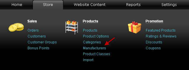Aller au menu Boutique - Produits et cliquer sur le lien Fabricants.