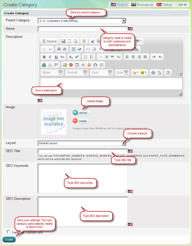 D'habitude les catégories sont organisées dans des niveaux pour aider les clients à naviguer facilement dans votre boutique. Choisissez un emplacement pour la nouvelle catégorie. Vous pouvez ou mettre la nouvelle catégorie au niveau supérieur ou la subordonner à une catégorie existante. On fournit la liste de catégories existantes dans un menu déroulant. Mettre la catégorie au niveau supérieur choisir "Niveau Supérieur" ou choisir une catégorie à laquelle la nouvelle catégorie appartient.