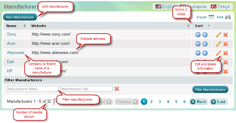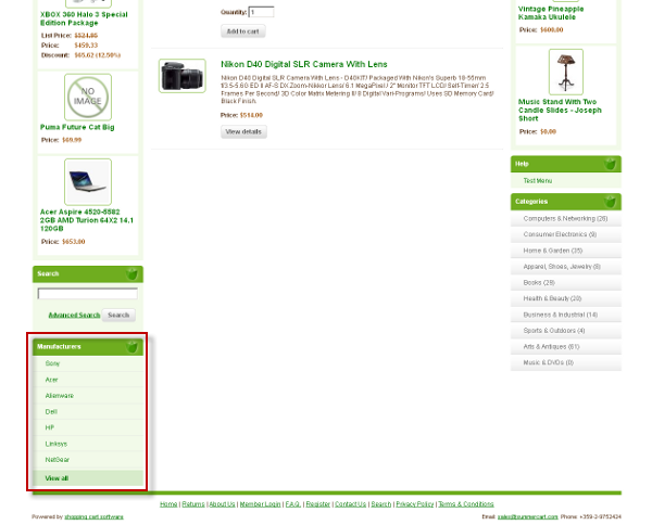 Utilisez la page "Fabricants" à afficher sur le site Web certains ou tous les fabricants qui travaillent avec vous. Vous pouvez présenter les fabricants par leur nom, organiser l'ordre de tri et de fournir un lien direct ou d'un renvoi. La liste des fabricants est visible dans la colonne de gauche ou droite (selon la configuration de votre mise en page personnalisée) à la page d'accueil. Dans le panneau d'administration, vous pouvez également supprimer un fabricant.