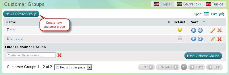 La page "Groupes de clients" vous permet de définir les types de clients à qui vous offrez différents niveaux de prix. Ici, vous pouvez créer des nouveaux groupes de clients, modifier ou supprimer ceux qui existent déjà. Vous pouvez créer un nombre illimité de groupes de clients et de les gérer facilement à l'aide d'options de tri et de filtrage.