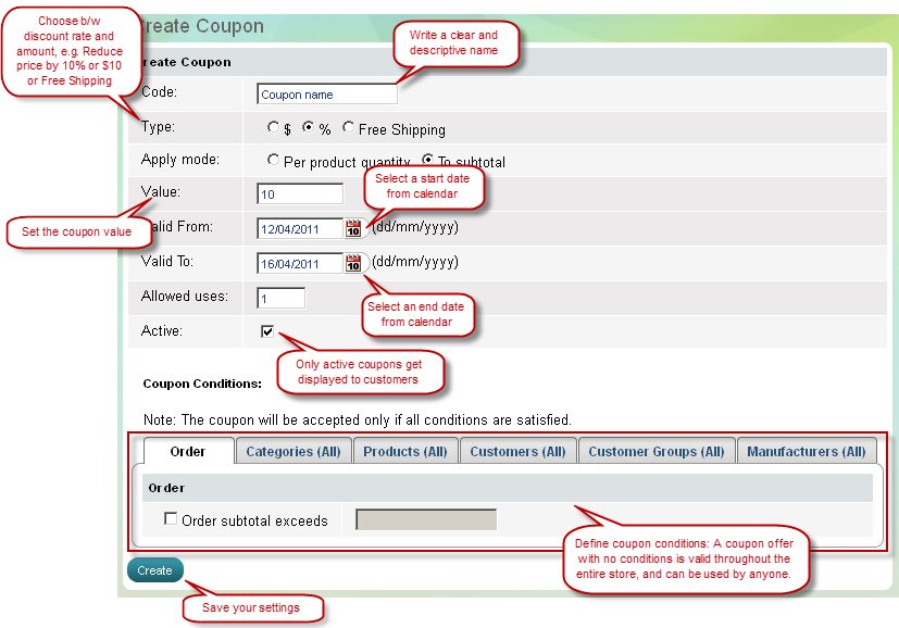 Page "Créer coupon"a Code, Type, Valeur, Valable du, Valable jusqu'au, actif. La page "Créer coupon" a aussi 6 onglets qui vous permettent de mettre en place 6 conditions d'actualisation: onglet Commande, onglet Catégories, onglet Produits, onglet Clients, onglet Groupes de Clients et l'onglet Fabricants.