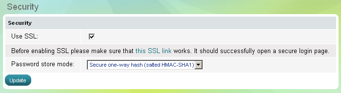 Tous les mots de passe - client et administrateur - peuvent être hachés (crypté) à sens unique avec une méthode extrêmement sécurisé, en utilisant l'algorithme HMAC-SHA1.