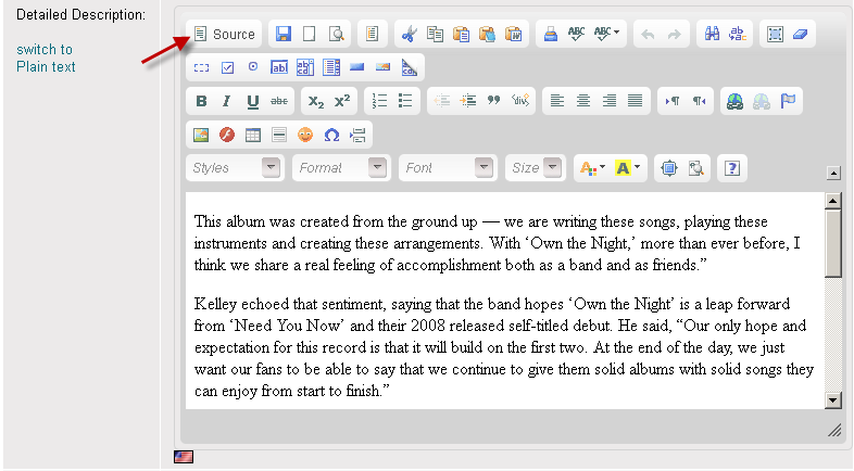 Éditer le produit. Vous devez passer à l'éditeur WYSIWYG "Source" mode.