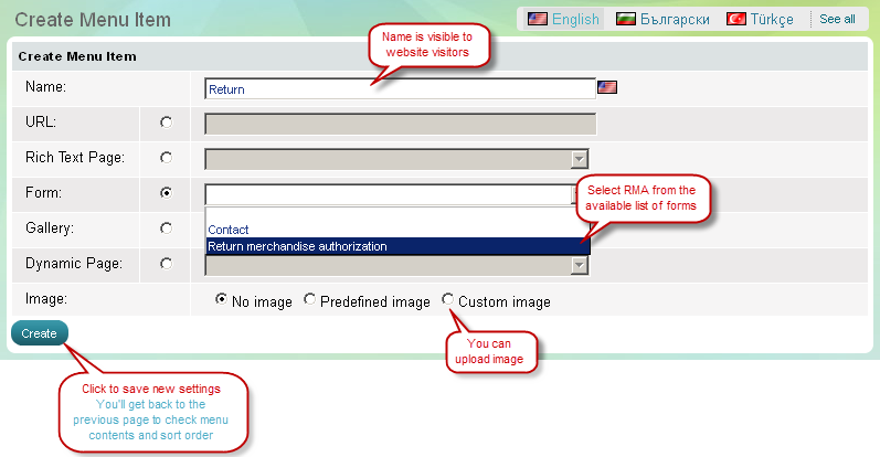 Voir la section "Éléments menu". Chaque élément peut être un lien, une page ou un formulaire. Vous pouvez personnaliser les options de menu de 3 manières: