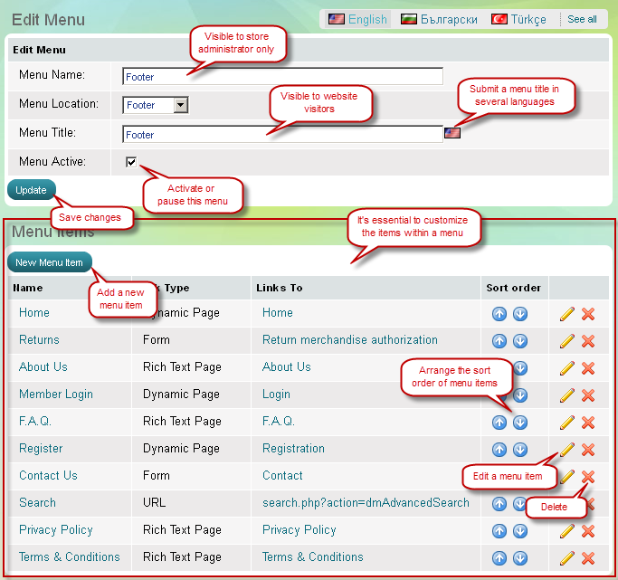 Dès que vous avez sélectionné un menu et ouvert la page "Éditer menu", vous pouvez personnaliser les éléments dans ce menu.