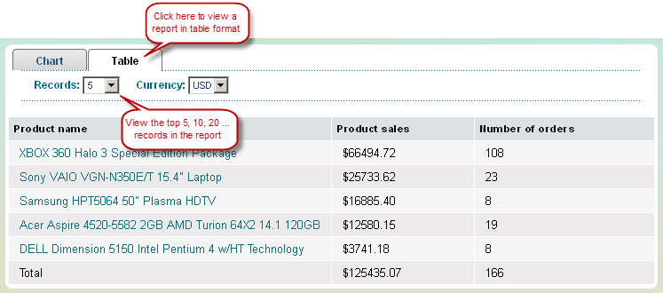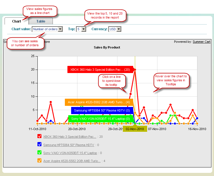 Summer Cart génére des rapports de synthèse par des graphique à barres et sous forme de tableau, et des rapports détaillés par des graphiques en ligne et sous forme de tableau.