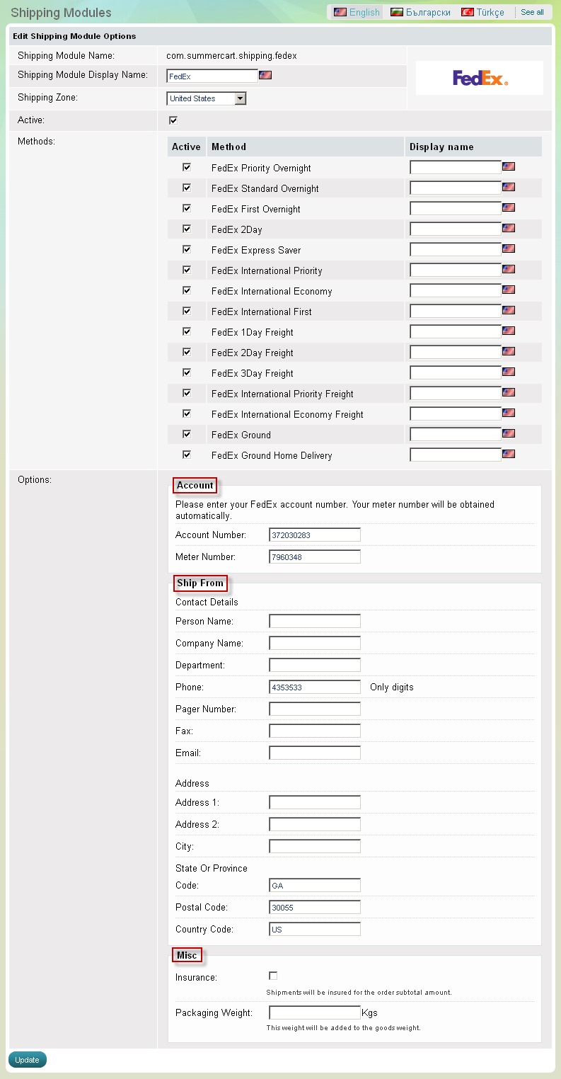 Le module de livraison "FedeEx" est intégré dans Summer Cart qui vous permet de calculer en temps réel les frais d'expédition. Pour mettre en place en temps réel le calcul configurez FedEx comme suit:
