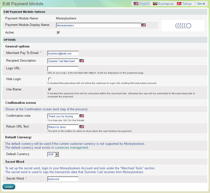 Sélectioner module de paiement "Moneybookers"