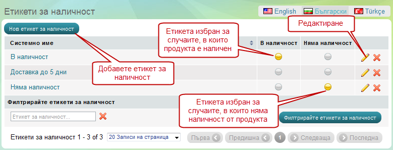 С тази функционалност Вие може да изберете по един етикет за случаите, в които има наличност от продукта и за тези, в които няма. Също така може един етикет да отговаря и за двата случая, но тогава едва ли ще имате нужда от тази функционалност.
