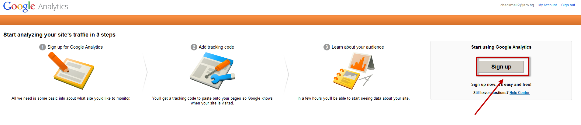 After having created a Google Account, or if we already have one, you can click on “Create Account” in Google Analytics and a new page is going to open where you click “Sign Up”