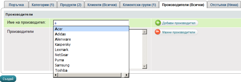 Раздел 'Производители' в страницата 'Редактирайте отстъпка'