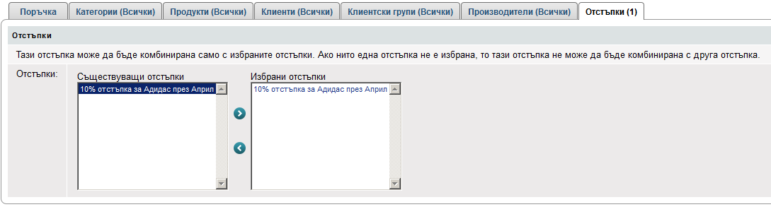 Можете да комбинирате (наслагвате) отстъпки за клиентите. Ако сега примерно създадем отстъпка от 5% за покупки за над 300 лв, и искаме тя да бъде прибавена към отстъпката 10% за Адидас през Април, можем да го направим от тук. Отляво се избира с коя отстъпка може да се комбинира, кликва се върху нея и със стрелкичката надясно се вкарва в списъка с избраните за комбиниране отстъпки.