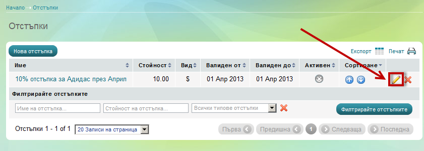 2. От списъка с отстъпките, изберете отстъпката, която искате да редактирате, и кликнете върху моливчето на края на реда.
