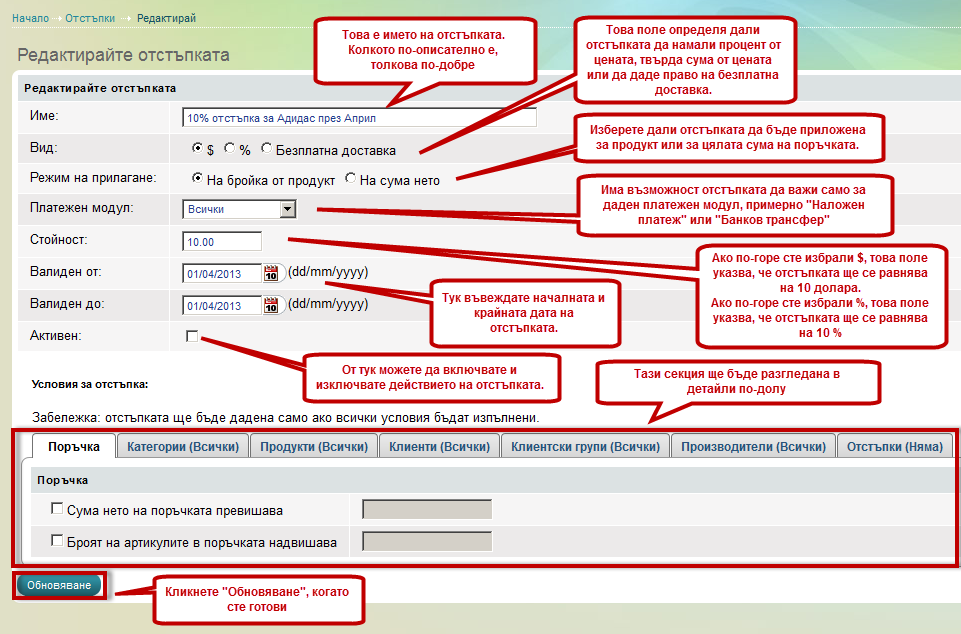 Страница 'Редактирайте отстъпка' има полета Име, Вид, Стойност, Валидна от, Валидна до, и Активна, които съдържат основна информация за отстъпката. На страница 'Редактирайте отстъпка' също така има 7 раздела, които Ви помагат да установите 4 условия за отстъпка: раздел Поръчка, раздел Категории, раздел Продукти, раздел Клиенти, раздел Клиентски групи и раздел Отстъпки.