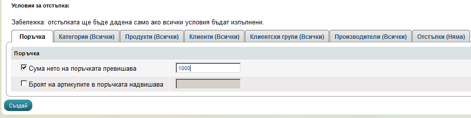Вие можете да поставите едно или повече условия в предложението си за отстъпка с помощта на раздел Поръчка, раздел Категории, раздел Продукти, раздел Клиенти, раздел Клиентски групи, раздел Производители и раздел Отстъпки.