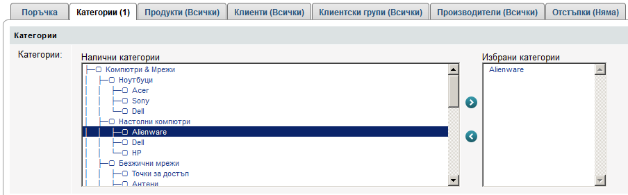 Раздел 'Категории' в страницата 'Редактирайте отстъпка'