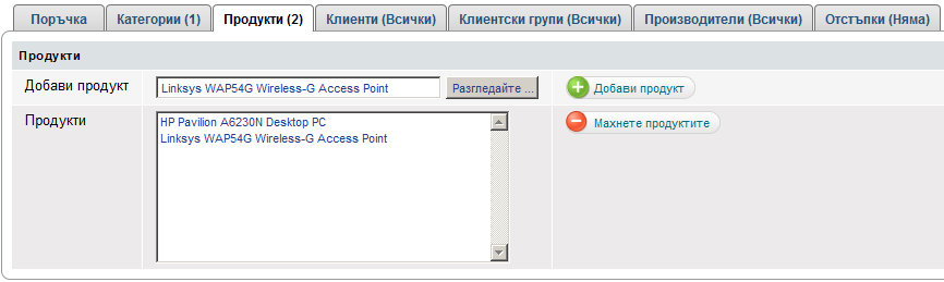 Раздел 'Продукти' в страницата 'Редактирайте отстъпка'