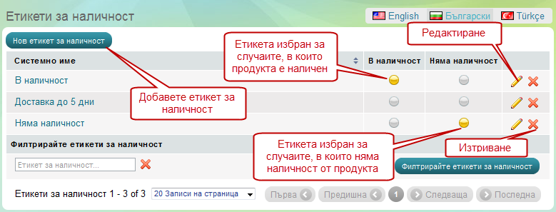 След това натиснете върху бутона "Нов етикет за наличност", за да добавите нов етикет. Също така имате възможност, да изтриете или редактирате даден етикет.