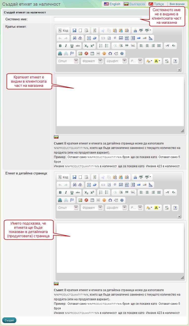 При създаването на етикети за наличност единственото задължително поле е "Системно име", което не е видимо в клиентската област на магазина Ви.