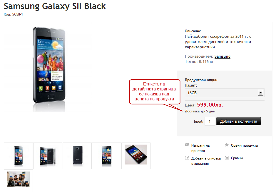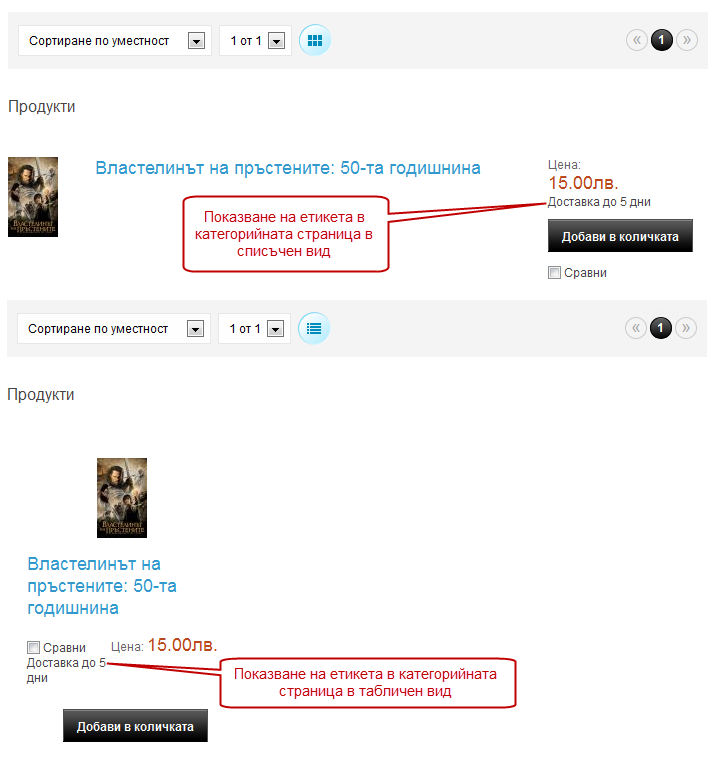 Кратък етикет: Визуализира се във всички списъчните страници (страница на производител, категория, начална страница - водещи продукти), без значение дали продуктите се показват в списъчен или табличен вид.