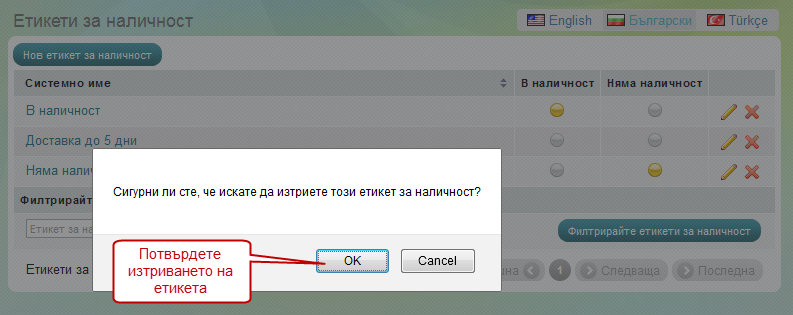 За да изтриете етикет за наличност е нужно, просто да натиснете . След това просто трябва да потвърд...