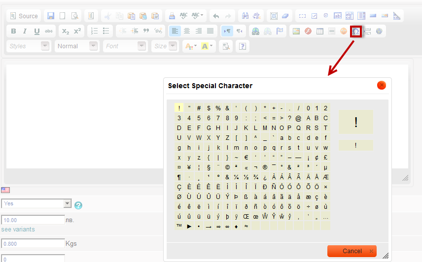 Insert special character - brings up a list of special characters to choose from