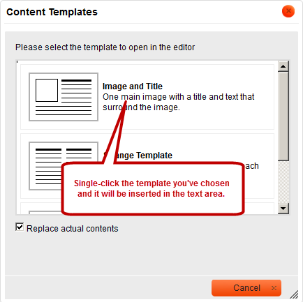 Click the button and a templates window will open up. Click the template you've chosen once and it will be inserted in the text area, ready to be used.