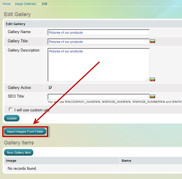 - on the "edit gallery" page click "import images from folder"