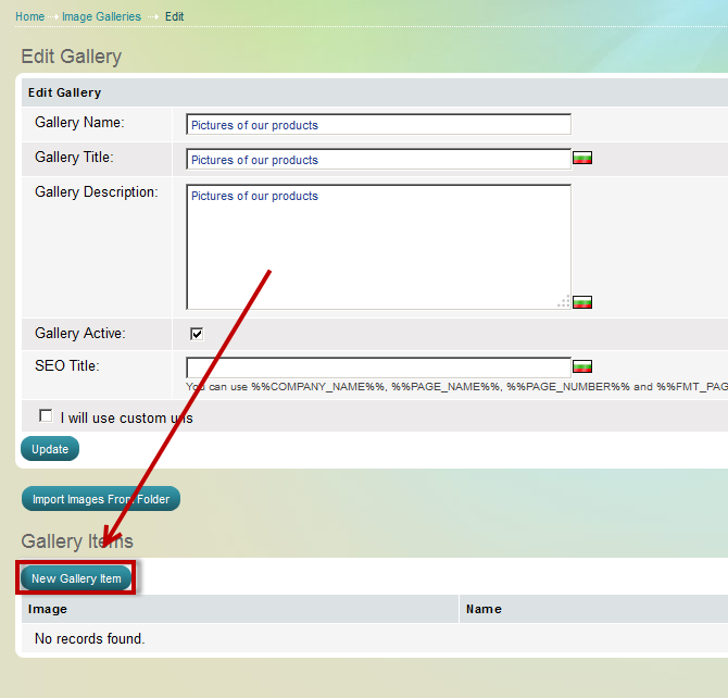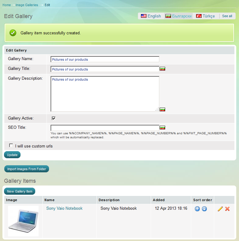 - connect to the server via FTP and upload images to the automatically created folder "userfiles/galleries/pictures of our products" (the system automatically creates a folder with the name of the gallery upon gallery creation)