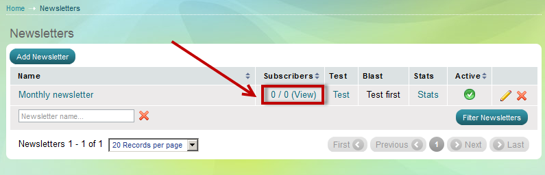A list of all newsletters opens up. On each newsletter's row there is a link to the list of subscribers. To add subscribers, click on the link.