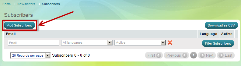 This is a list of the newsletter subscribers. In our case, there are no subscribers and we are going to add one.