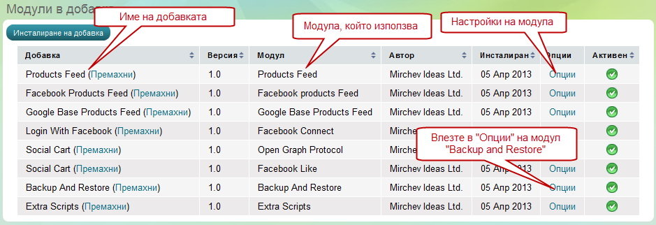 От името на самата добавка става ясно, че тя се използва за създаване на backup-и на Вашият магазин, а когато е нужно и за връщането им. За да стигнете до добавката трябва да влезете в "Настройки" > "Добавки". Може да си набавите добавката от този адрес или в края на статията.