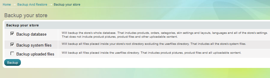 За да направите backup на магазина си, натиснете линка Backup your store. Пред Вас ще се отвори следният екран: