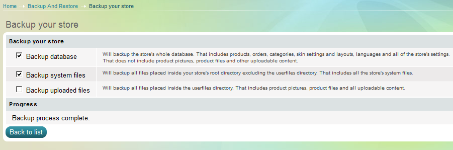 - Backup uploaded files - ще направи и запази копие на всички файлове в папката USERFILES - продуктови снимки, продуктови файлове и други неща, които сте качили в магазина.