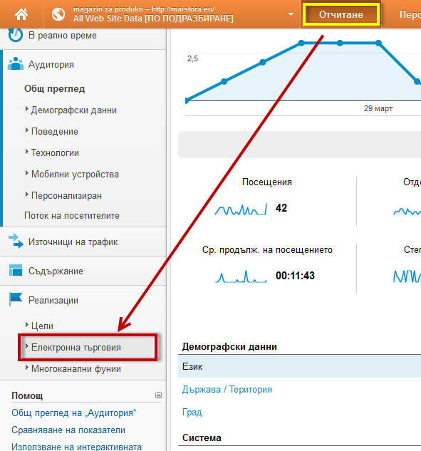 - кликнете на секция "Реализации" -> "Електронна търговия" -> "Общ преглед";