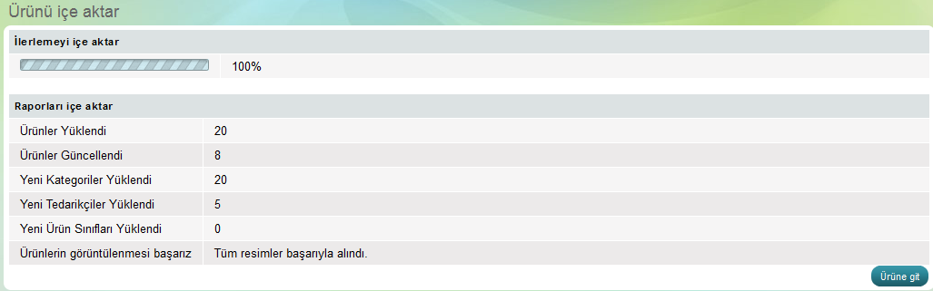 Yükleyeceğiniz CSV dosyasını seçtikten sonra "Ürünleri Toplu Yükle" butonuna basın ve bekleyin. Sonuç aşağıdaki gibidir.