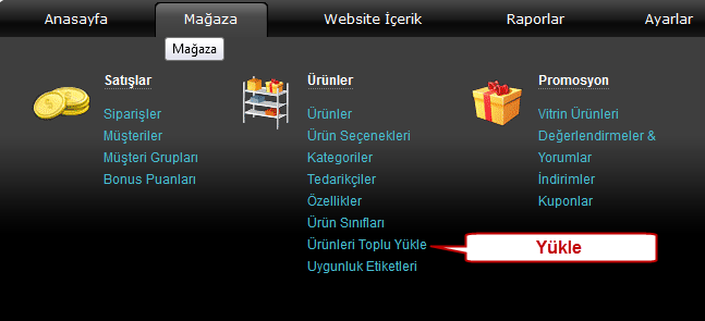 CSV ile ürün yüklemek için "Mağaza" >> "Ürünler" >> "Yükle" menüsüne girmeniz gerekiyor.
