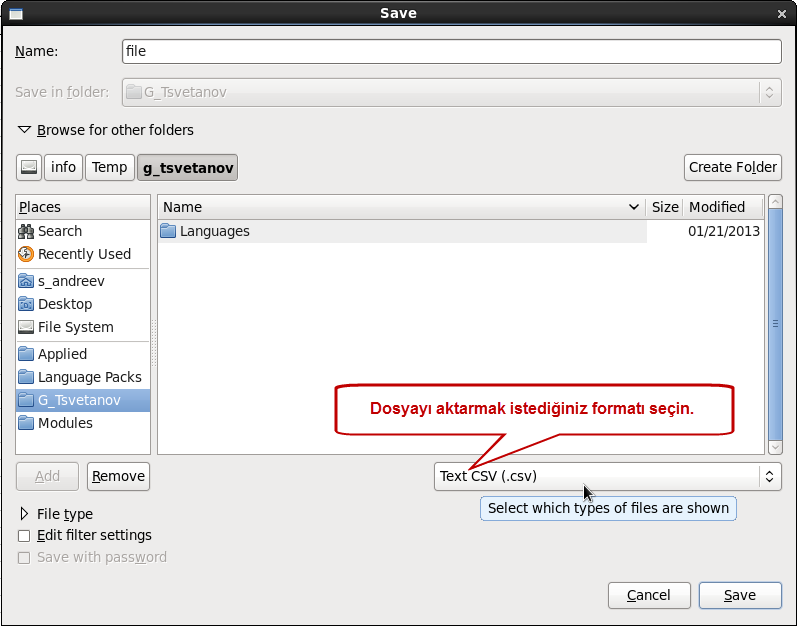 3. Açılır menüden „Text CSV (.csv)“ seçınız.