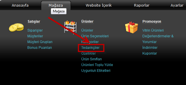 1. Mağazanın admin panelini açıp menüden "Mağaza" >> "Ürünler" altında "Tedarikçiler" bağlantısına tıklayın.