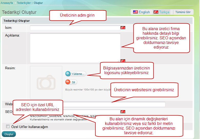 Özel Url'ler kullanacağım - Bu seçenek tedarikçilerinizin URL adreslerini kendiniz oluşturmak istediğinizde kullanılıyor. Daha iyi SEO amaçlı yapılabilinir.