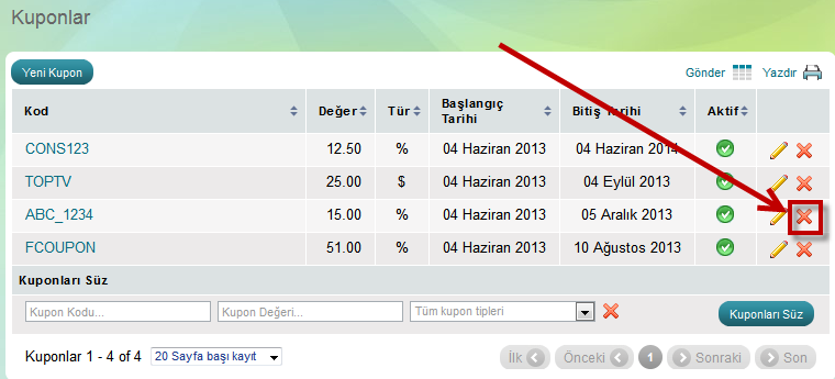 Filtreleme seçeneklerini kullanarak silmek istediğiniz kuponu bunun ve sıranın sonunda silme ikonuna tıklayın. Açılan pop-up sayfada silmek istediğinizi onaylayın.