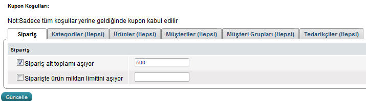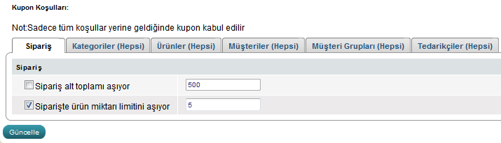 Aynı anda minimum sipariş fiyatı ve siparişte ürün adeti girerek kuponun kriterlerini kombine edebilirsiniz. Örneğin müşteri en-az 4 ürün ve toplam fiyat 1000TL olduğunda kupon uygulanabilir.