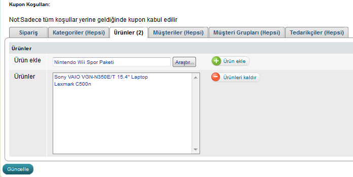 Tedarikçi eklemek için "Tedarikçi İsmi:" alanına tam ismi ve bir kısmını girin. Açılır menü şeklinde mağazanızaki tedarikçilei göreceksiniz. Seçtiniz tedarikçinin üstüne tıklayarak "Tedarikçi Ekle" butonuna tıklayarak ekleyebilirsiniz. Bu şekilde tedarikçiyi kupona kriter olarak ekleyebilirsiniz. Müşterileriniz sadece o tedarikçinin ürünlerini sipariş yaparsa kupondan yararlanabilecekler.