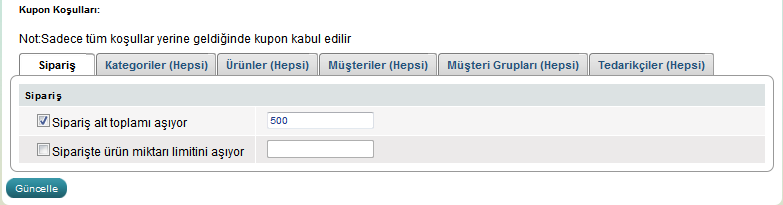 Kuponlara bir veya birden fazla koşullar koyabilirsiniz. Kopon koşulları 6 böşüme ayrılıyor: sipariş, kategoriler, müşteriler, müşteri grupları, ürünler ve tedarikçiler.