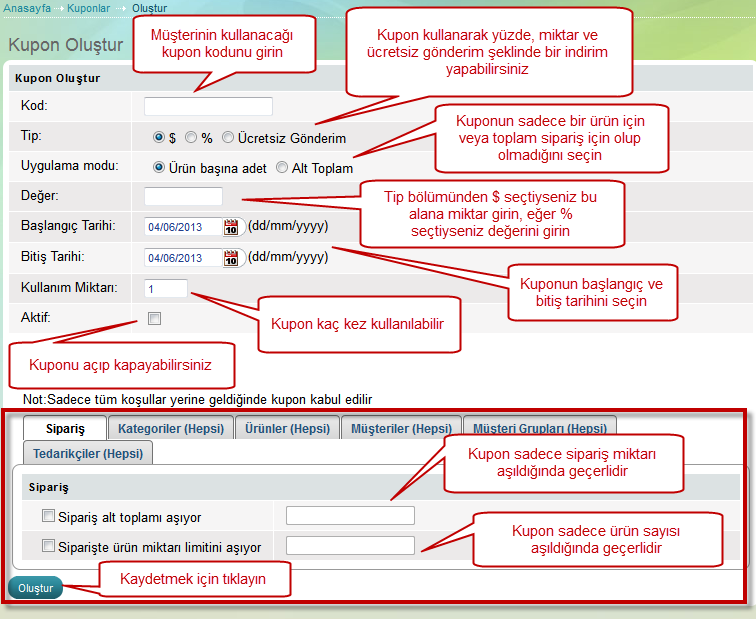 Öneri: Kuponu düzenlerken hemen atıfleştirme mecburiyetiniz yok. Daha sonra "Kuponlar" sayfasından sadece bir tıklama ile aktifleştirebilirsiniz.