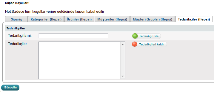 Tedarikçi eklemek için "Tedarikçi İsmi:" alanına tam ismi ve bir kısmını girin. Açılır menü şeklinde mağazanızaki tedarikçilei göreceksiniz. Seçtiniz tedarikçinin üstüne tıklayarak "Tedarikçi Ekle" butonuna tıklayarak ekleyebilirsiniz. Bu şekilde tedarikçiyi kupona kriter olarak ekleyebilirsiniz. Müşterileriniz sadece o tedarikçinin ürünlerini sipariş yaparsa kupondan yararlanabilecekler.