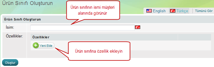 Daha sonra yeni ürün sınıfı oluşturmak için "Yeni Ürün Sınıfı" butonuna tıklayın. Genel olarak ürün sınıfları özelliklerden oluşuyor, ama isim alanıda doldurulması gerekiyor, çünkü müşteri kısmında detaylı arama kısmında isimleri gözüküyor.