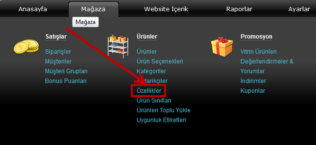Özellik oluşturmak ürün sınıfı oluşturmasına bakarak biraz daha yavaş ve zahmetli bir iştir, ancak bu özelliklerin bir çok ayar içerdiğinden kaynaklanmaktadır. Özellik oluşturmak için menü'den "Mağaza" >> "Özellikler" bağlantısına tıklayın.