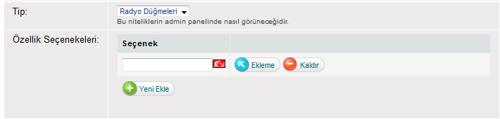 Tip "Radyo Düğmeleri" - Bu tip özellikler için özellik seçenekleri girilmesi gerekiyor. Her özellik seçeneği ayrı bir radyo düğmesi olacaktır.
