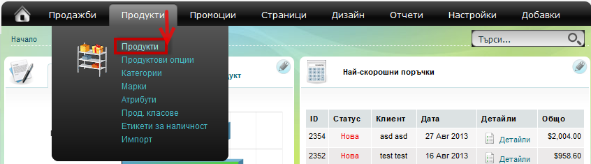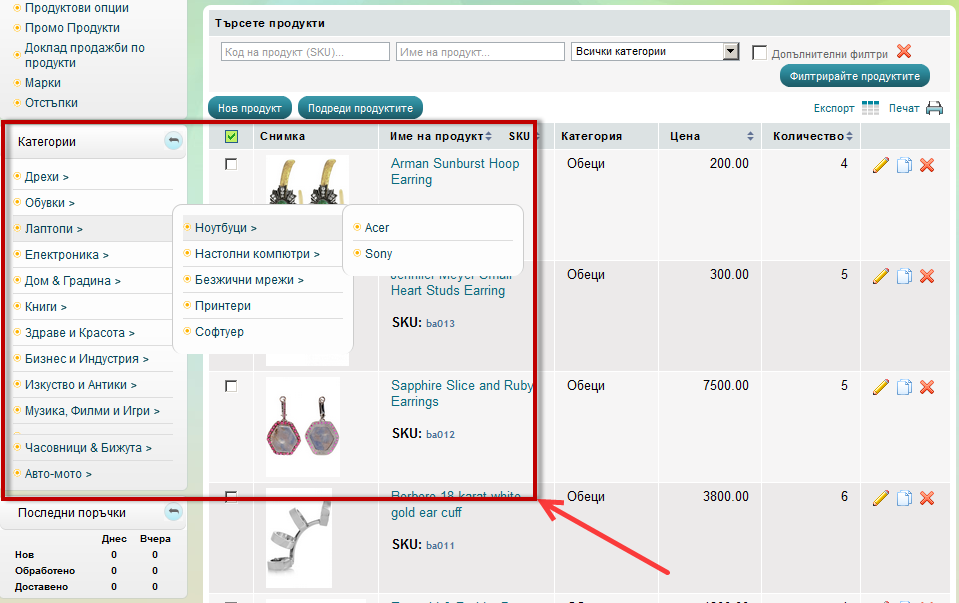За по-лесно управление на продуктите в категориите използвайте Менюто с Категории в административната област: